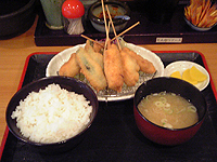 揚げたての串が5本!そしてご飯に味噌汁にお漬物!!