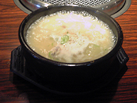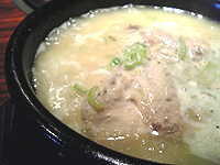 さてさて、サムゲタン!感じで書くと「参鶏湯」。韓国の代表的なお鍋の一つです!若鶏、もしくは丸ごとの鶏の腹を割いて、その中にもち米、栗、干しナツメ、高麗人参、松の実など、薬膳料理の食材としてよく知られたものを詰め合わせたて、それを長時間煮込みます。その煮込みに用いた器に入った状態の熱いままで供される。よく煮込まれているため肉がほぐれ,スプーンだけで食べることができるんです!
