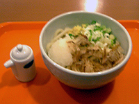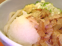 うどんの上には、かつお節とネギ、そして大根おろしがのっています♪ガマはそれに、レジ横に置いてある(取り放題)ショウガをトッピングしました。