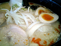 スープは、背油がたくさん浮いていて、ニンニクげんこつラーメンをマイルドにした感じです。醤油の味より豚骨の味がぐんと引き立っています。もともと花月のラーメン好きなガマは大満足!麺の上にのっているチャーシューは口の中でとろけますし、煮玉子は半熟でスープに合います!