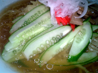 麺の上には、チャーシュー2枚にキューリ、メンマ、紅しょうがに薄くスライスされた玉ねぎ!この玉ねぎがいい味だしてます!!!