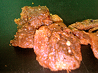 さて、その夜ビールを飲みながら、早速試食を!袋から出てきたのは、ちょっとグロテスクな形をした乾燥肉!味は、焦げた風味もあってパサパサした焼き鳥の砂肝!!!コショウも効いていて、なかなかの美味♪ビーフジャーキーとは違う美味しさなんです☆