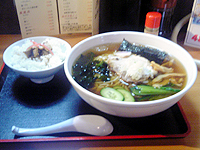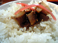そして写真ではあまり目立ちませんが、分厚くて大きいチャーシューが、これまた美味い!この冷しラーメンには、トッピングライスが付いていて、ご飯の上にも刻んだチャーシューが乗っていて、こちらも大満足の味です。恐るべし「ときわ亭」!